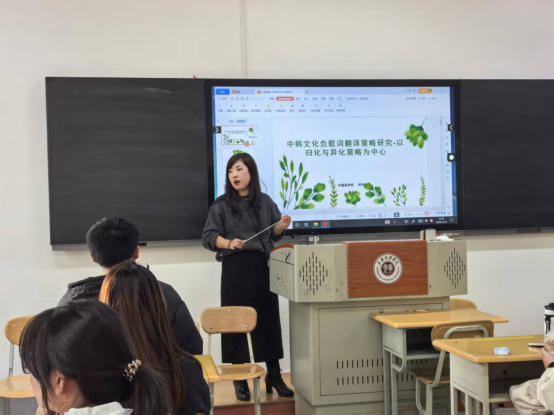 2025年12月2日下午,外国语学院在文华楼403教室举办了以《中韩文化负载词翻译策略研究——以归化与异化策略为中心》为主题的学术讲座。本次讲座由尹燕博士主讲,系统梳理了文化负载词的分类及其在中韩翻译中的处理策略,吸引了学院师生广泛参与。