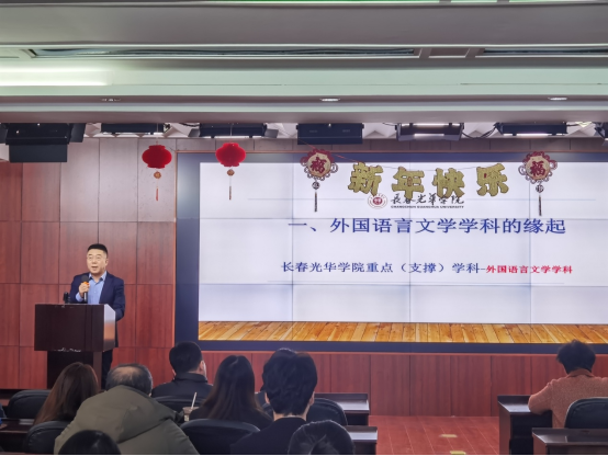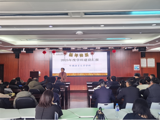外国语言文学学科负责人崔建立教授系统汇报了2025年度学科建设情况。他从人才培养、科学研究、社会服务等方面全面总结了学科取得的进展与成果,并详细介绍了2026年学科工作计划与2027年发展愿景。本次汇报内容详实、目标清晰,充分体现了外国语言文学学科团队对学科建设的高度重视与系统规划。崔建立教授在汇报中强调,学科的发展离不开全体成员的共同努力与持续投入,并对学科全体教师的辛勤付出表示衷心感谢。未来,外国语学院将继续以学科建设为抓手,推动外国语言文学学科实现高质量发展,不断提升学科影响力与竞争力。