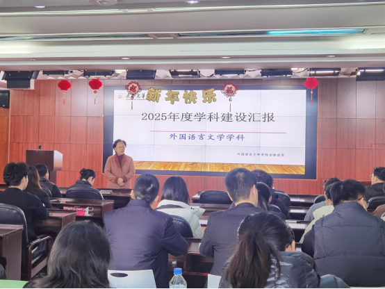 2026年1月8日,外国语学院召开2025年度学科建设与科研工作总结会暨2026年度工作部署会。外国语学院商薇院长主持会议,外国语言文学学科负责人崔建立教授、科研秘书李晓媚老师分别作专题汇报,外国语学院学术方向带头人、系主任及全体教师参加本次会议。