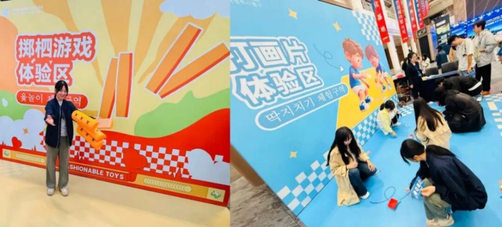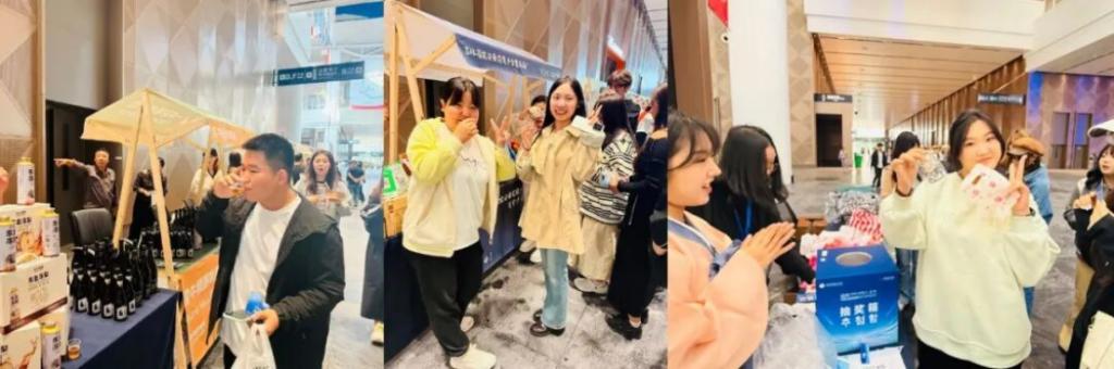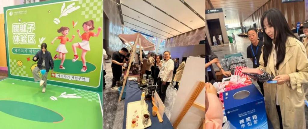 走进中韩城市馆,师生们首先开启了文化探索之旅。在展馆内,通过图文展板、实物陈列与互动体验,大家系统了解了中韩(长春)国际合作示范区的发展历程、产业布局与未来规划,深刻感受到这片区域作为“东北亚区域经济合作引导区”的活力与潜力。随后,韩国传统游戏互动体验区成为全场焦点,学生们围在“掷柶游戏”“投壶”等传统游戏摊位前,在韩国友人的耐心指导下,一边学习游戏规则,一边用韩语交流技巧,指尖的互动与语言的碰撞,让文化体验变得鲜活有趣。另一区域的中韩商品市集同样热闹,从韩国特色美食、美妆产品到中国地方特色饮食,琳琅满目的商品吸引着师生驻足,学生们用韩语与摊主沟通,询问商品细节,在实际场景中锻炼了语言表达能力。