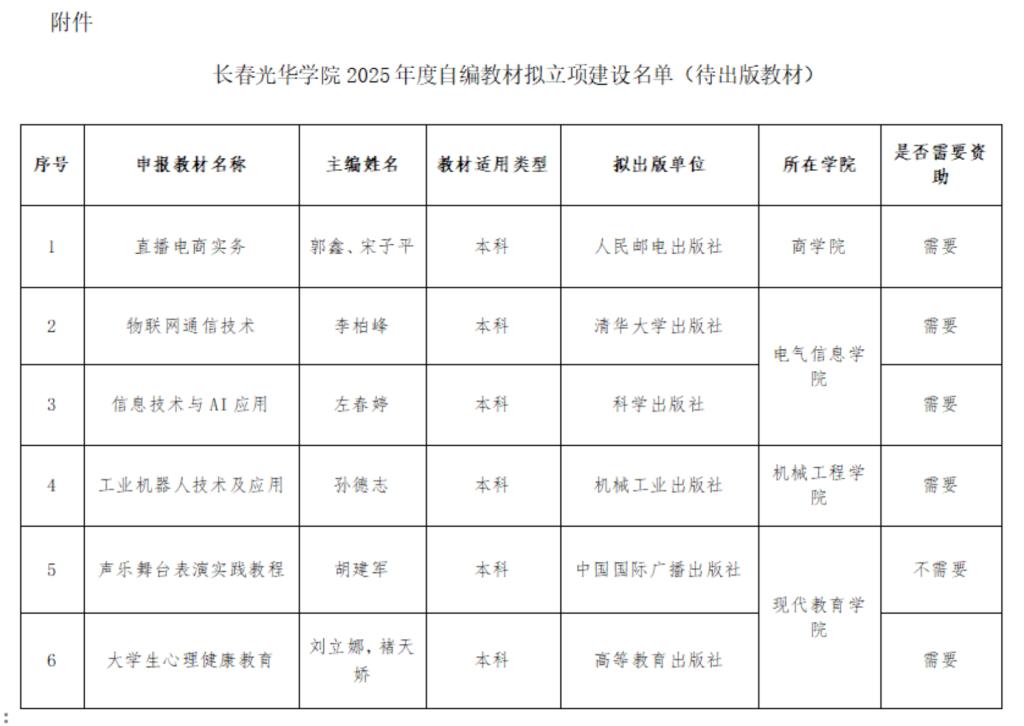 经个人或团队申报、学院初审推荐、专家审定、校内公示等环节,最终确定《直播电商实务》等6部教材列为2025年度立项建设教材,《财务管理》等12部党的十八大以来已出版且未列入学校规划教材,具备长春光华学院为第一署名单位、我校教师为第一主编等条件,经个人申请,根据有关规定纳入学校自编教材立项管理中。